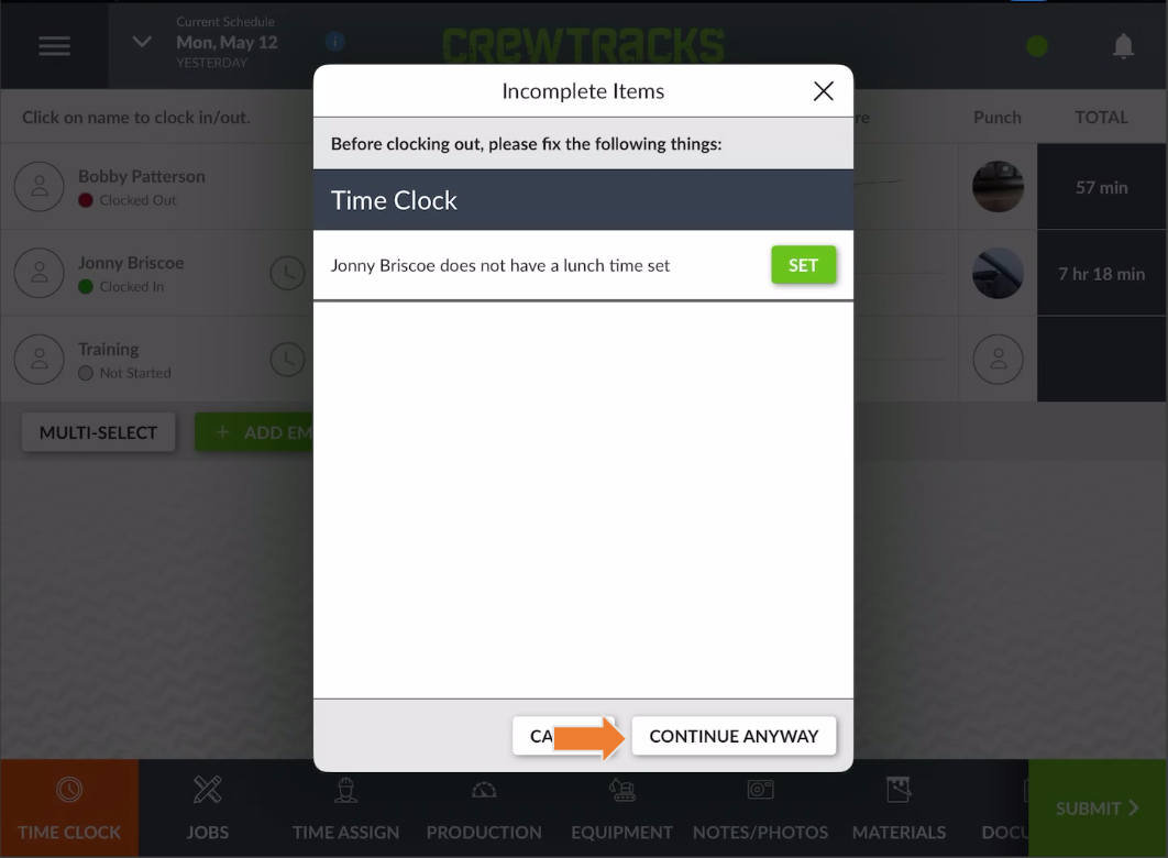 The user will receive a dialog when clocking out an employee, prompting them that the employee they are attempting to clock out has not had a lunch time set. If they tap "CONTINUE ANYWAY" and complete the clock out process, the lunch time will get automatically added to that employee's shift
